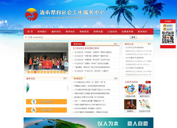 海南帮邦社会工作服务中心团队成立于2014年5月,经过两年的摸索与准备,于2016年5月正式申请注册,7月18日由海南省民政厅审批通过,是向政府和社会提供社会工作专业服务的民间非营利性专业机构。帮邦宗旨:以人为本,助人自助,关爱及帮助弱势群体。帮邦理念:致力于打造一支专业化、职业化、本土化的优秀社会工作服务团队,为有需要的个人、家庭及社会群体提供高质量的服务,共创和谐社会。中心文化:互助、诚信、仁爱、尊重。服务内容:就业帮助服务、家庭综合服务、社区综合服务、志愿者服务、社会工作者培训服务、承接政府和企事业单位及社会组织委托的社会工作岗位和社会服务项目。